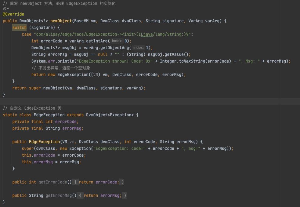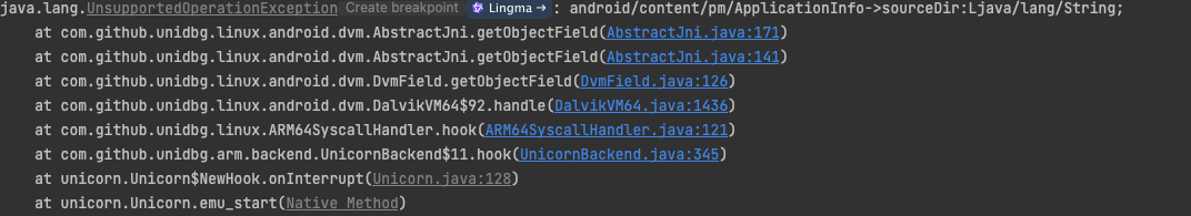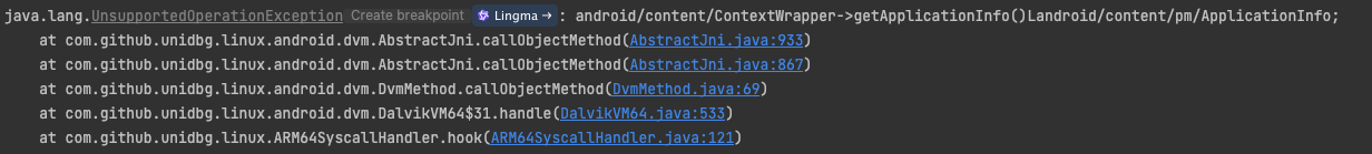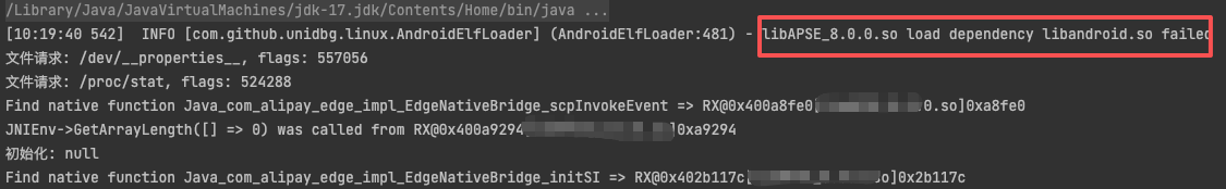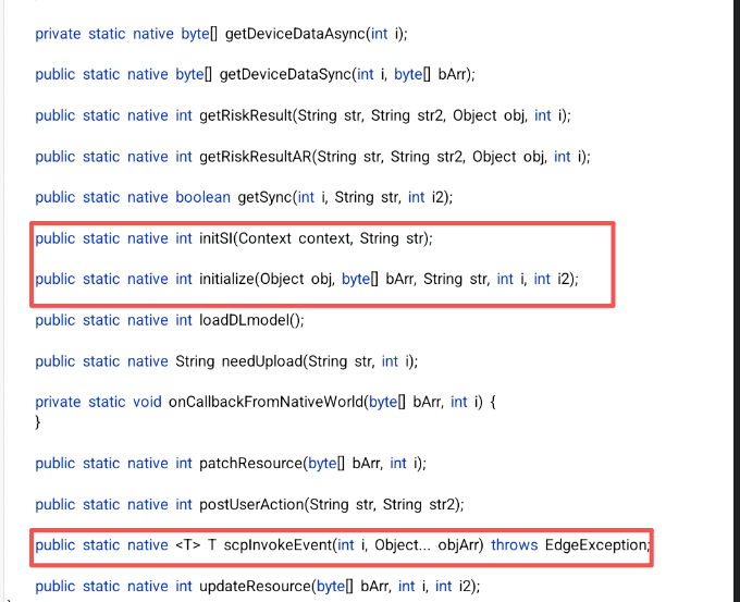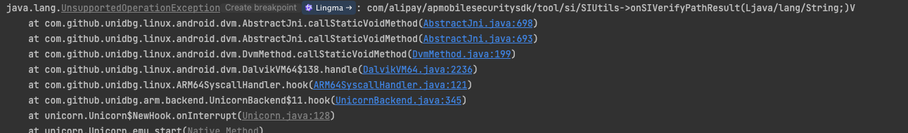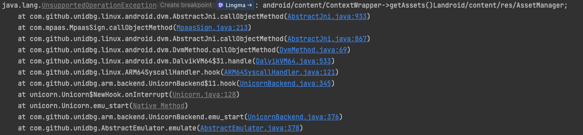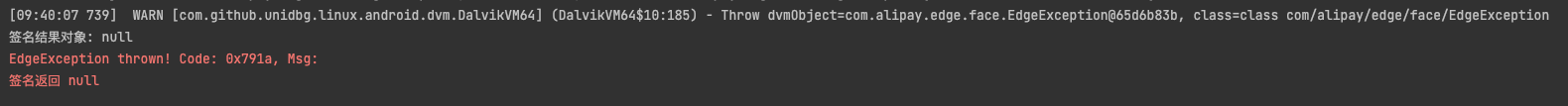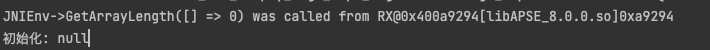 很好,补环境有效,但是却出错了,抛出了异常,签名也没有返回!为什么会这样呢?这里就直接给答案了:因为没有调用初始化方法。 从JNI 方法的截图中也能看出蛛丝马迹,这里再看下之前的截图