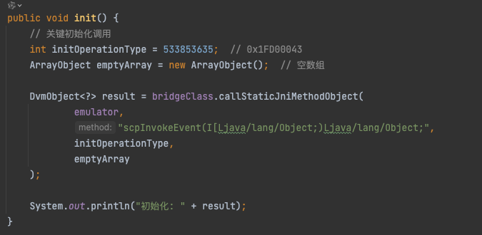 可以发现在调用目标方法scpInvokeEvent前,就先调用了一次scpInvokeEvent�和 initSI 方法,第一次调用scpInvokeEvent�传的参数不一样,并且没有返回值,这里就按着这个顺序,在 Unidbg 中执行下,一个一个来,先调用第一个