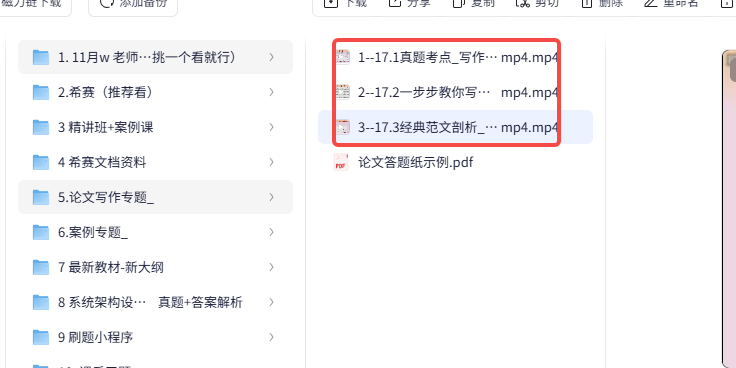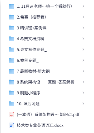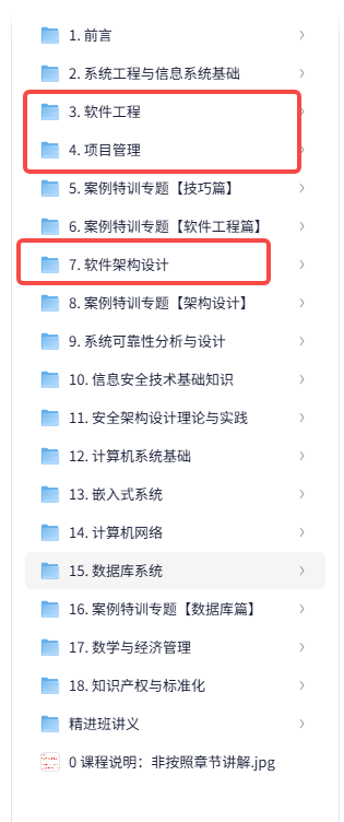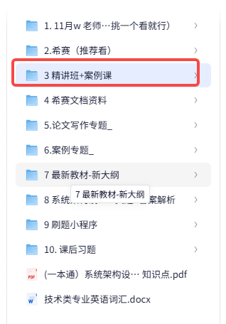 第一阶段:看视频,为什么不是看书呢?软考高级的书是很厚的,看起来也乏味,最主要的是看书不知道什么是重点,建议是看视频,书的话就当字典来用。我收集的资料里面有三个视频,我选择是“精进班+案例课”这个视频,视频是某赛的,含金量还是挺高的。