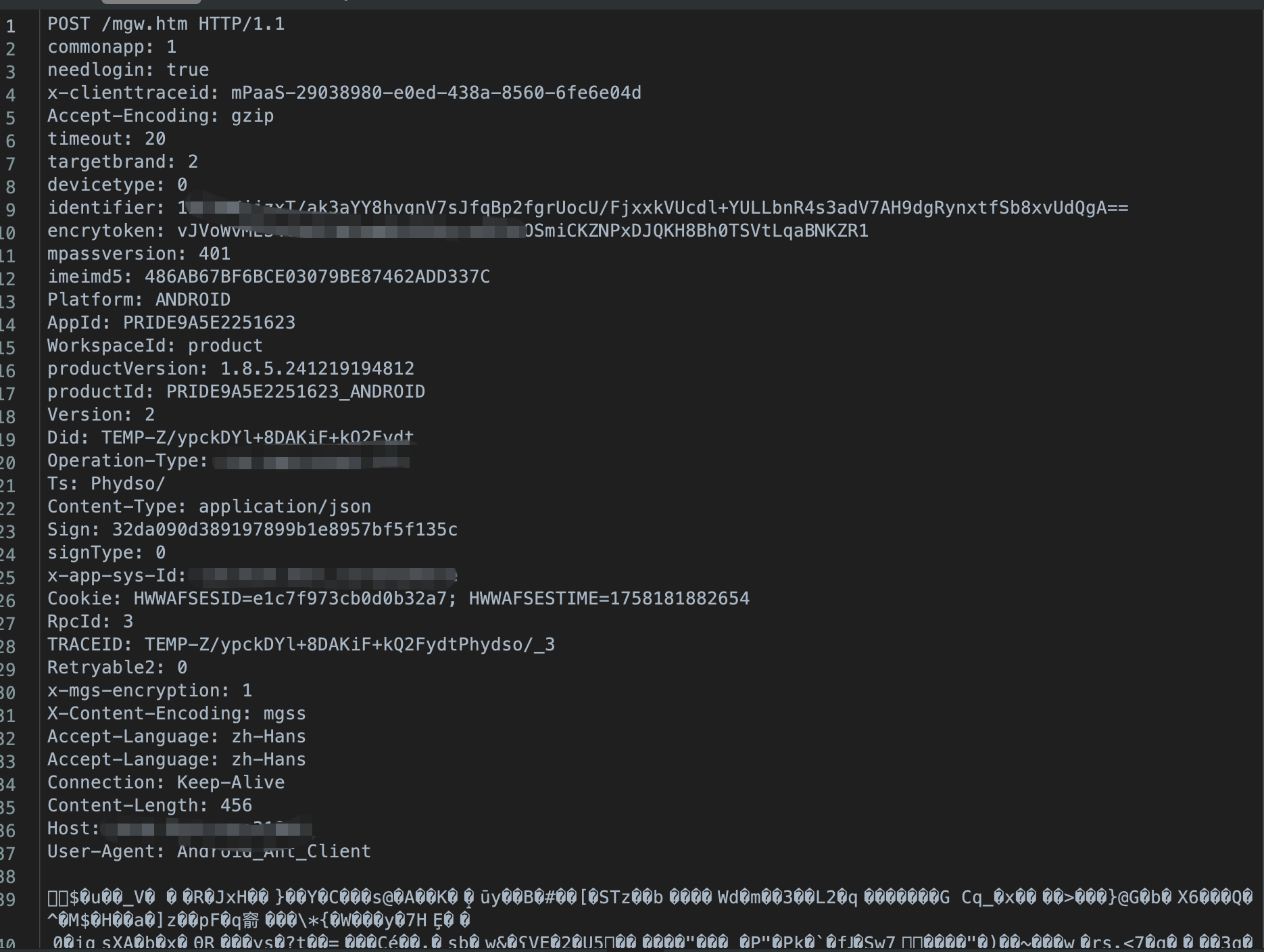 从请求头中的x-clienttraceid字段中能看关键词:mpaas,再看下请求体,直接看是乱码