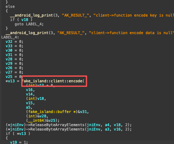 可以发现这个代码是静态注册的,也没经过任何的混淆,代码往下拉,可以看到调用了fake_island::client::encode